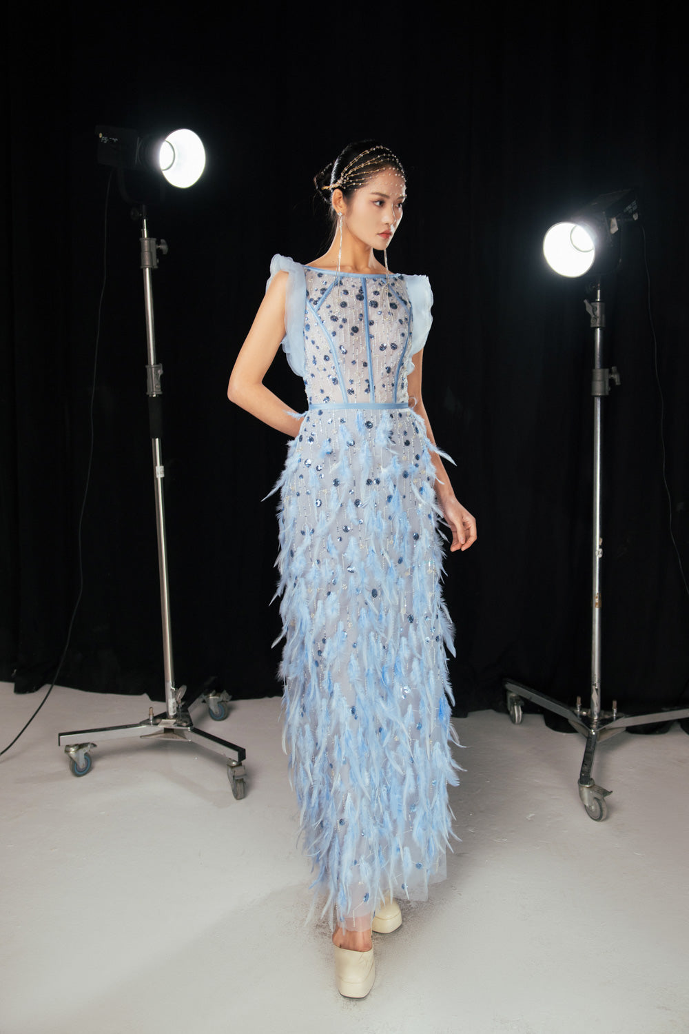 Crafted with delicate feathers and graceful twill, this dress exudes elegance and sophistication. Its sheath silhouette and floor length design will make you feel like a work of art. Elevate your wardrobe with this exclusive dress.